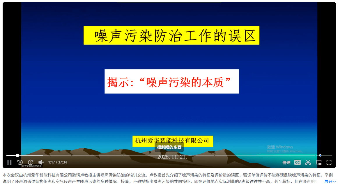 2025年11月21日,杭州愛華智能科技有限公司有幸邀請了原廣州市環境監測中心站教授級高級工程師盧慶普老師前來交流指導,并通過線下和線上視頻會議模式,為從事噪聲監測及污染防治工作的廣大客戶朋友做了“噪聲污染防治工作誤區與本質探析”專題培訓交流會。